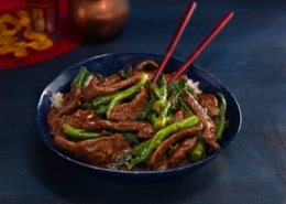 This stir-fry dish of beef and greens was served often at my childhood family dinner table, using our homegrown bounty of fresh picked gai lan, also known as Chinese broccoli. My daily job was to clean the garden vegetables for our meals, a job I disliked immensely since there were plenty of caterpillars and insects to pick out. That aside, when my mom would start cooking, I really enjoyed the scent of garlic, ginger and beef being fried and I couldn’t wait to eat! The method of slicing the beef steak thinly across the grain and marinating it ensures that each bite is quick-cooking, juicy and flavorful. The tender baby gai lan is first blanched, then added at the end of cooking for a quick reheat with the beef and savoury sauce. Be sure to have all the ingredients measured and ready to go as this dish cooks quickly. Serve with hot cooked rice.
