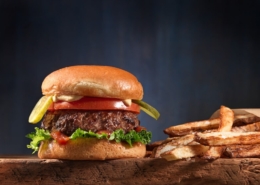 A classic combination, this air-fryer version yields juicy hamburgers and crispy fries. The bonus of cooking hamburgers in the air fryer is that you can set them and forget them. No need to flip them and you still get an evenly cooked burger, every time. French fries can be cooked in either one or two layers but no more as it will prevent crisping. Note: Cook times suggested are based on a counter-top family-size air fryer**; times will vary with different appliances so always check for doneness with a reliable digital instant-read thermometer and texture cues and adjust cook time as necessary. Beef burgers are done when the thermometer reads 160°F (71°C).