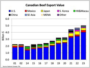 ![]() La valeur des exportations de bœuf canadien a dépassé la barre des 5 milliards $ en 2023, dépassant le précédent record de 4,68 milliards $ atteint en 2022, malgré un léger fléchissement du volume des exportations. De janvier à décembre 2023, les exportations de bœuf ont augmenté de 7 % en valeur et diminué de 2 % en volume par rapport à l'année précédente. Les valeurs d'exportation de bœuf ont atteint des niveaux records vers les États-Unis (+17%) et le deuxième niveau le plus élevé jamais enregistré vers le Mexique (+32%). Du côté du volume, les résultats annuels ont bénéficié d'une forte demande en décembre, où les volumes d'exportation de bœuf canadien ont augmenté de 9% d'une année à l'autre et de 31% par rapport à la moyenne quinquennale pour le mois de décembre. Pour 2023, les volumes d'exportation de bœuf sont en hausse vers les États-Unis (+4%), Hong Kong et Macao (+18%) et le Mexique (+22%), et les exportations diminuent vers le Japon (-33%), la Corée du Sud (-25%), l'Asie du Sud-Est (-25%) et le Moyen-Orient - Afrique du Nord (-26%).Les exportations vers le Mexique sont les plus élevées depuis 2010. Le commerce international a été affecté par les taux de change, en particulier en direction de l'Asie, mais dans l'ensemble, les prix étaient robustes, poussant les valeurs à un nouveau record, a noté Canfax. La production nationale a diminué de 5% en 2023, mais les volumes d'exportation n'ont baissé que de 2%, indiquant qu'une proportion relativement plus élevée de la production de bœuf canadien était destinée au marché d'exportation en 2023. En 2022, les exportations de bœuf canadien se sont chiffrées à 511 000 tonnes, soit la deuxième année en importance pour le volume d’exportation, ce qui représente à peine 10 500 tonnes de moins que le record de 2002, et la plus importante année jamais enregistrée pour la valeur des exportations. Le travail de Bœuf Canada sur les marchés internationaux continue de créer des occasions pour l’industrie canadienne du bœuf de réaliser une plus grande valeur pour la carcasse que ce qui pourrait être réalisé sur le seul marché intérieur. Selon Canfax, les exportations de bœuf apportent une valeur supplémentaire de 1 158 $ par tête/carcasse (moyenne quinquennale 2018-2022) au conditionneur qui détermine la valeur tout au long de la chaîne d'approvisionnement. Cela représente 40 % de la valeur de l'animal engraissé. Retour à la page d’accueil |