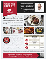 ![]() New video resource highlights Canada Prime grade beef The Canadian Beef Centre of Excellence team recently developed a new video resource to raise awareness of Canada Prime grade beef and highlight its value proposition for foodservice operators. Sector users are often unaware that Canadian beef is available in Prime grade. In this informative promotional resource, Chef Michael Allemeier, one of only five Certified Master Chefs in Canada, discusses the quality attributes of Canada Prime grade beef and how these attributes enhance the dining experience for guests. ![]() In this short video, Chef Allemeier starts by explaining the designation of Certified Master Chef and his journey to achieving this prestigious designation. A longtime ambassador of Canadian beef, Chef Allemeier discusses the importance of using high-quality ingredients to deliver consistent guest satisfaction.Chef Allemeier points out that modern foodservice guests are educated and looking for more than a meal; they are looking for an experience. He further explains that Canada Prime grade beef is an excellent way to build confidence in menu offerings, from both the operator and chef's perspectives. This resource is designed to educate and inspire operators and culinary professionals to use Canada Prime grade beef in their operations. Watch the video here>. Back to main page ![]() ![]() CAMERON PAPPEL Director, Canadian Beef Centre of Excellence Studios MATHIEU PARÉ Executive Director, Canadian Beef Centre of Excellence |