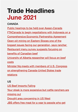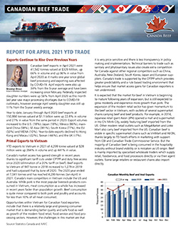 ![]() Find trade headlines, market intelligence and market updates, trade reports and export statistics. Weekly Trade Headlines ![]() Canada Beef provides a weekly selection of news headlines from around the world related to the beef industry. Click here to view Trade Headlines. Quarterly Domestic Market Intelligence Report ![]() A summary of market intelligence information related to the Canadian economy, retail, foodservice, and wholesale sectors as well as imports. Click here to view Quarterly Domestic Market Intelligence Report Q2. Quarterly Market Update Webinar ![]() An on-demand webinar featuring market analysis on the economy and factors influencing the sales of Canadian beef. Click here to view Quarterly Market Update Webinar June 2021. Monthly Canada Beef Trade Report ![]() Summary report on trends for imports and exports of Canadian Beef. Click here to view Canadian Beef Trade Report April 2021. Monthly Canadian Beef and Veal Exports Statistics ![]() Statistics for Canadian beef and veal exports by volume, value and price. Click here to view Beef and Veal Exports April 2021 Monthly Red Meat Trade with the EU and UK ![]() Statistics for Canadian meat exports to the EU and also imports from the EU to Canada by volume, value and price. A separate report for meat exports to the UK is available at the same link. Click here to view Red Meat Trade with the EU April 2021. Back to main page |