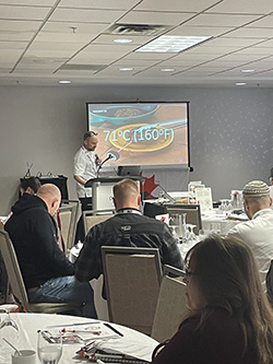![]() Le CEBC organise des séances de dégustation lors de la conférence de la Fédération culinaire Les chefs Mathieu Paré et Cameron Pappel du Centre d'excellence du bœuf canadien (CEBC) ont animé deux séances de dégustation de bœuf canadien dans le cadre de la Conférence 2025 de la Fédération culinaire (FC) à Moncton, au Nouveau-Brunswick. Les chefs nationaux membres, les jeunes chefs membres et les étudiants en cuisine ont participé à une activité de dégustation pour en apprendre davantage sur la qualité gustative et les caractéristiques des coupes de bœuf canadien les plus performantes pour l'industrie de la restauration. Les réactions ont été très positives, de nombreux participants soulignant qu'ils n'avaient jamais fait l'expérience d'une dégustation comme celle-ci et exprimant leur appréciation pour les informations fournies par les chefs. ![]() Cette collaboration avec la Fédération culinaire nationale du Canada a permis de recueillir des notes et des données précieuses sur les dégustations qui serviront de base à l'élaboration de nouvelles ressources de formation en matière de restauration par le CEBC. Après trois séances de dégustation en partenariat avec les membres de la FC, plus de 100 chefs et étudiants en cuisine ont fourni leurs données d'évaluation des dégustations. Le kiosque de Bœuf Canada au salon annuel CF Marketplace présentait plusieurs ressources de formation, notamment le nouveau programme Passerelle des restaurants, le concours des meilleurs plats à base de bœuf canadien et les outils de formation en ligne à venir pour le secteur de la restauration, tels que le programme de formation sur le bœuf canadien certifié. De plus, l'équipe du CEBC a participé en tant que juge au concours annuel Quickfire de la Fédération culinaire, où le flanc de bœuf canadien était un ingrédient requis pour les plats sur le thème du Surf & Turf. Retour à la page d'accueil ![]() ![]() CAMERON PAPPEL Directeur, studios du Centre d'excellence du bœuf canadien MATHIEU PARÉ Directeur exécutif, Centre d'excellence du bœuf canadien |