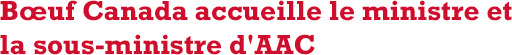 ![]() Bœuf Canada a eu le plaisir d'accueillir le ministre d'Agriculture et Agroalimentaire Canada (AAC), Lawrence MacAulay, et la sous-ministre d'AAC, Stefanie Beck, au Centre d'excellence du bœuf canadien (CEBC) le 2 août. C'était formidable de se retrouver et de discuter d'objectifs communs pour faire croître l'industrie du bœuf au Canada. Le président de Bœuf Canada, Michael Young, le vice-président exécutif, Mark Klassen, et le vice-président des Affaires générales, Ron Glaser, ont présenté aux ministres une mise à jour sur la performance du marché intérieur et du marché d'exportation du bœuf canadien, ainsi que sur les priorités et les possibilités actuelles. La réunion a été l'occasion de mettre en avant les services du CEBC par le biais d'une visite du studio de découpe de viande, où le groupe a assisté à une production vidéo en cours. Le ministre MacAulay, également agriculteur, a été nommé ministre de l’Agriculture et de l’Agroalimentaire lors du remaniement ministériel du 26 juillet, poste qu'il avait déjà occupé de 2015 à 2019. La sous-ministre occupe ce poste depuis le 20 février 2023. Bœuf Canada se réjouit de travailler avec l'équipe d'AAC. Retour à la page d'accueil |