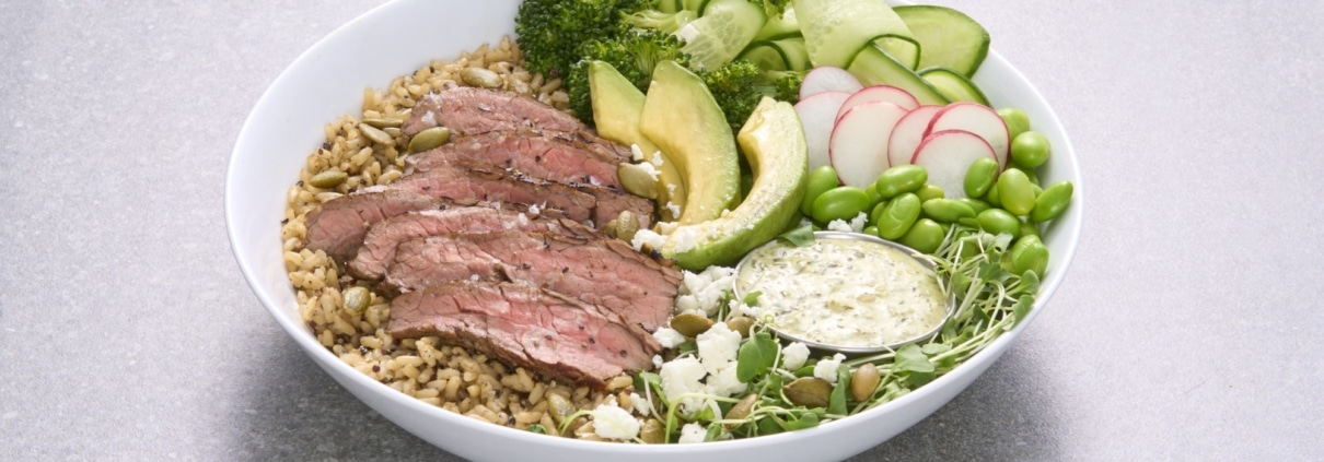 Bright and vibrant, this bowl is full of fresh flavours and wholesome ingredients. The lean strips of grilled steak and bold marinade offer a satisfying umami element to the dish. It’s all served with a hearty mix of greens, grains and a simple creamy pesto dressing.