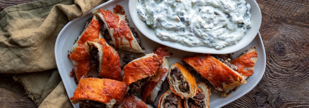 There are few things I love more than giving leftovers a second life, especially during the holiday season when fridges everywhere are a chaotic mix of mystery containers and half-finished roasts. These tasty little bites were born of a chunk of pot roast in my fridge along with some leftover caramelized onions and mushrooms I’d made for something else entirely. Rolled up and baked into crispy phyllo pastry, this finger-food take on classic beef Wellington is flaky, savoury, and just a bit indulgent…and exactly the kind of thing people devour at holiday gatherings before you even finish putting the tray down. Served with warm spinach dip, you can’t lose! Recipe adapted from the original developed by Dan Clapson of eatnorth.ca.